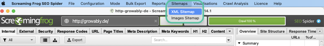 - Wenn das Crawling zu 100% abgeschlossen wurde, klicke nun auf “Sitemap” → XML Sitemap